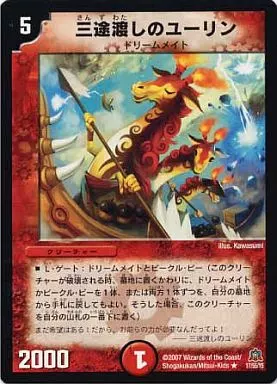 Japanese title: デュエルマスターズ/R/火/クリーチャー/ドリームメイト/[DM-23]不死鳥編 第5弾 冥龍王帰還(ジ・エンド・オブ・ユニバース) 17/55/Y5[R]:三途渡しのユーリン