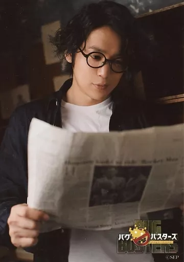 Japanese title: 生写真(男性)/俳優 磯貝龍虎(徳山秀治)/上半身・衣装黒・白・眼鏡・右向き・両手新聞紙/舞台「バグバスターズ -Stage Yellow-」ランダムブロマイド(私服バージョン)