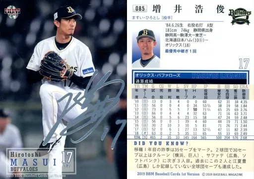 Japanese title: BBM/レギュラーカード/オリックス・バファローズ/BBM2019 ベースボールカード 1stバージョン 085 [レギュラーカード] : 増井浩俊(銀箔押しサイン入り)