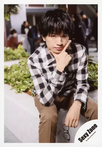 Japanese title: 生写真(ジャニーズ)/アイドル/Sexy Zone Sexy Zone/中島健人/膝上・衣装黒・白・チェック柄・座り・右手顎・左手眼鏡/アルバム「PAGES」MV&ジャケ写オフショット/公式生写真