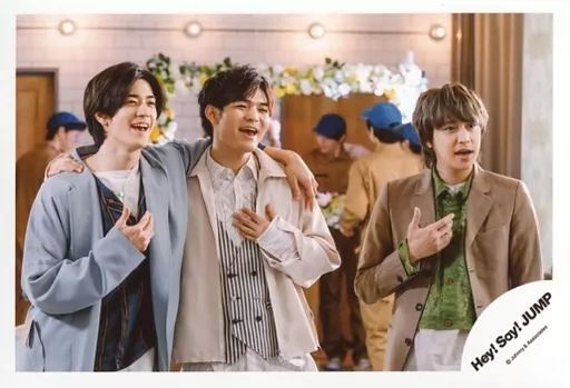 Japanese title: 生写真(ジャニーズ)/アイドル/Hey! Say! JUMP Hey! Say! JUMP/集合(3人)/横型・膝上・衣装水色・白・茶色・緑・右手胸元・中島と薮肩組み/DVDシングル「愛だけがすべて -What do you want?-」MV&ジャケ写オフショット/公式生写真