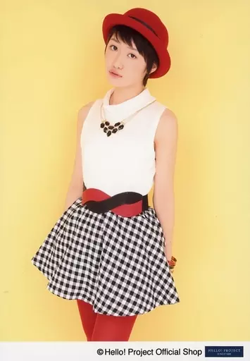 Japanese title: 生写真(ハロプロ)/アイドル/モーニング娘。’14 モーニング娘。’14/工藤遥/膝上・衣装白・黒・帽子赤・両手後ろ・左向き・背景黄色/“2014 Winter”パート6