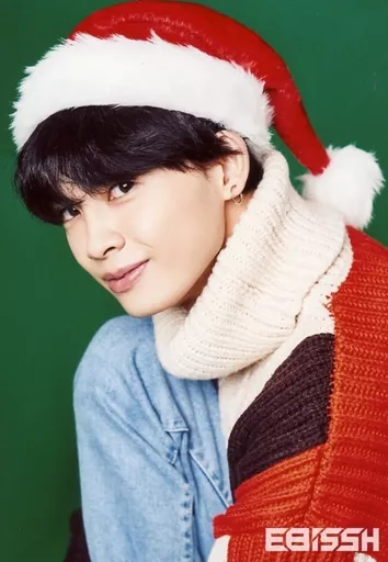 Official photo (Male) / Dance & Vocal Unit / EBiSSH EBiSSH/NAOYA / Bust up / Costume white / black / red / Santa hat / sitting / left facing / Background green / "Merry EBiSSHmas! 2018 ~ with FRIENDS! ~" EBiSSH Official photo Set #009