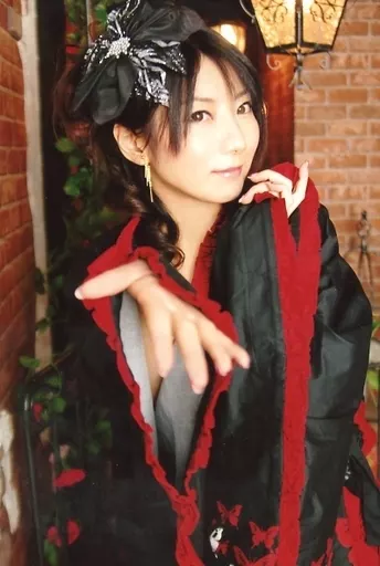 Japanese title: 生写真(女性)/声優 原田ひとみ/上半身・衣装黒・赤・右手差出し・左手曲げ・顔右向き・ポストカードサイズ/公式生写真