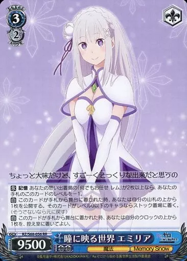 Japanese title: ヴァイスシュヴァルツ/RR/キャラ/ブースターパック Re:ゼロから始める異世界生活 Memory Snow RZ/S68-056[RR]:瞳に映る世界 エミリア