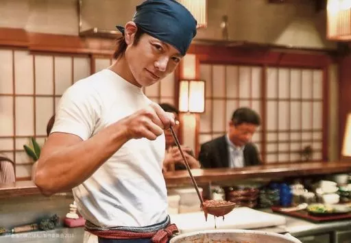 Official photo (male) / actor Taiyo Sugiura / Horizontal Type / Upper Body / White Costume / Right Hand Ladle / Right Direction / Tilted Neck / DVD Box 「 Last Supper 」 Special Official photo