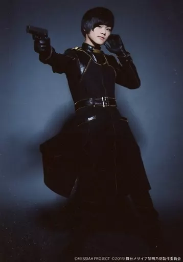 Japanese title: 生写真(男性)/俳優 長江崚行(御池万夜)/全身・体右向き・右手銃・足広げ・背景黒・キャラクターショット/舞台「メサイア-黎明乃刻-」ブロマイド ソロセットA