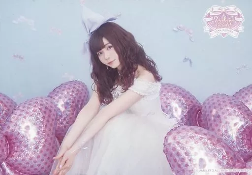 Japanese title: 生写真(女性) 諏訪ななか/横型・全身・しゃがみ・衣装白・両手合わせ・左向き・背景水色/諏訪ななか ファンクラブイベント「7 colors world」ブロマイド
