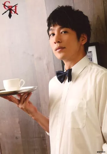 Japanese title: 生写真(男性) 磯貝龍虎/上半身・衣装白・蝶ネクタイ黒・左向き・右手トレー・カップ/「撃弾ハンサム『誰にも聞けないアソコのかゆみ事件簿2』~あれ以降、すべての芝居が色あせた~」ブロマイド