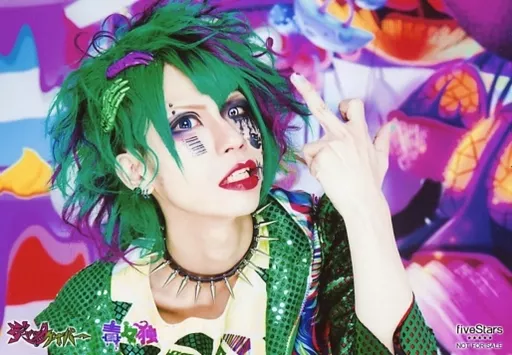 Japanese title: 生写真(男性)/ヴィジュアル系バンド/ジャックケイパー ジャックケイパー/李九/横型・顔アップ・衣装緑黄・左手中指立て・体右向き・背景カラフル/CD「毒々独」five Stars特典アーティストフォト