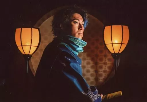 Official photo (male) / actor Uchikuri Uchikura / Horizontal, Upper body, Costume blue, Right facing, Mouth closed, Background beige, Black / Stage "Pius Planning 『 モナルコマキ - Ishikawa Goemon Iitan - 』" KUJI photo