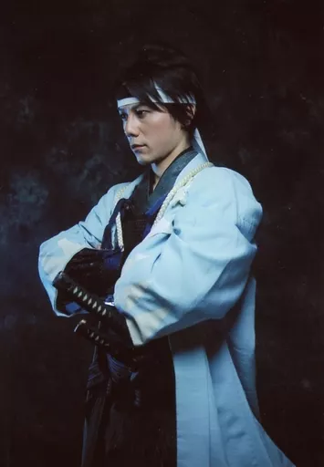 Japanese title: 生写真(男性)/俳優 根本正勝(土方歳三)/上半身・衣装水色・黒・左向き・腕組み・背景青・黒/舞台「BARAGA-鬼ki」
