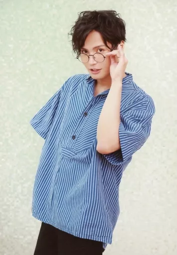 Japanese title: 生写真(男性)/俳優 友常勇気/膝上・衣装青・ストライプ柄・左手眼鏡・左向き・背景緑/「友常勇気 Summer Event 2018 ~勇気100%~」ブロマイド