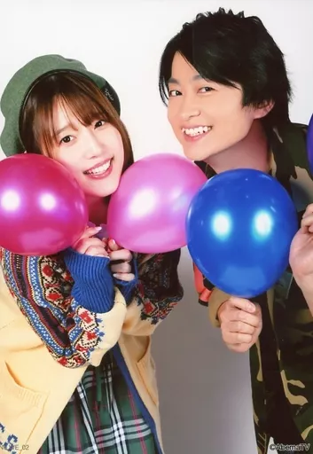 Japanese title: 生写真(男性)/声優 下野紘・内田真礼/膝上・衣装黄・迷彩模様・風船持ち・前屈み/「AbemaTV『声優と夜あそび』公開生放送 “夜あそびヒーローショー”」ブロマイド