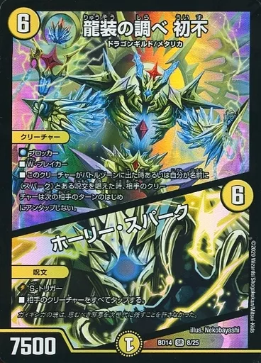 Japanese title: デュエルマスターズ/SR/光/[DMBD-14]クロニクル最終決戦デッキ 龍魂紅蓮譚 8/25[SR]:龍装の調べ 初不/ホーリー・スパーク