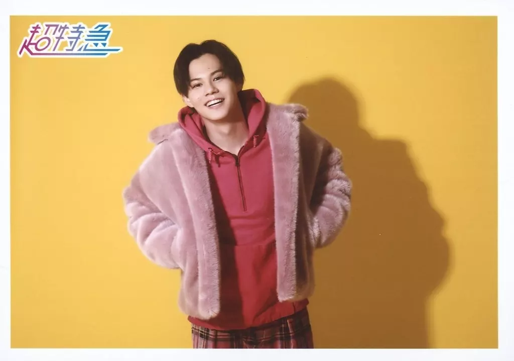 Super Express / Kai (Ogasawara Sea) / Horizontal / Knee-Top / Costume Pink / Red / Both Hand Pockets / Background Yellow / "BULLET TRAIN FUN CLUB TOUR 2020 『 Toooooo 8 』" 2/8 Official photo Set limited to Osaka Venue