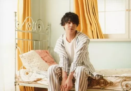 Japanese title: 生写真(男性)/俳優 上仁樹/横型・膝上・座り・衣装白・ストライプ・顔右向き・両手下・カメラ目線・ベッド・カーテン黄/「上仁樹 バースデーイベント ~TATSUKICHI BIRTHDAY PARTY 2018」ランダムブロマイド