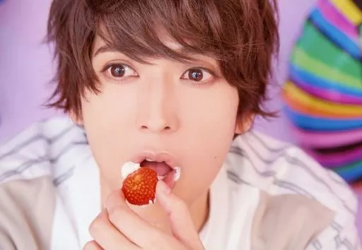 Japanese title: 生写真(男性)/俳優 仲田博喜/横型・顔アップ・衣装白・ストライプ柄・左手苺・目線左・口開け・背景紫/「仲田博喜『flying Birthday event』~誕生日はやっぱり皆と過ごしたい~」ブロマイド