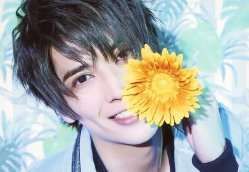 Japanese title: 生写真(男性)/俳優 仲田博喜/横型・顔アップ・衣装黒・水色・左手花・首傾げ・背景植物/「仲田博喜ソロイベント~平成はお世話になりました!令和も僕だけをみていてね~」ブロマイド