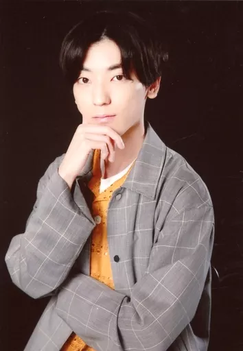 Japanese title: 生写真(男性)/声優 山谷祥生/上半身・衣装グレー.黄色・左向き・右手顎・背景黒/「山谷・八代のやや北の国から」ブロマイド