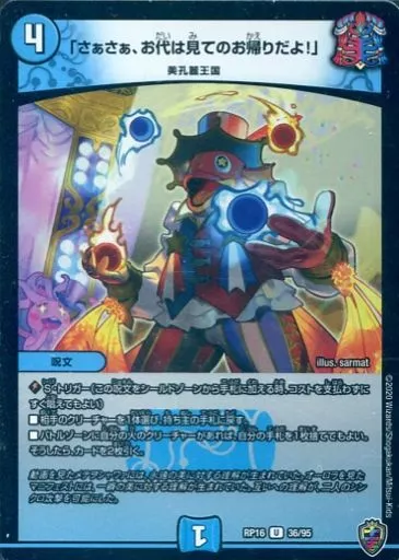 Japanese title: デュエルマスターズUC/水/[DMRP-16]十王篇 拡張パック第4弾 百王×邪王 鬼レヴォリューション!!! 36/95[UC]:「さぁさぁ、お代は見てのお帰りだよ!」(格子状ホロ仕様)