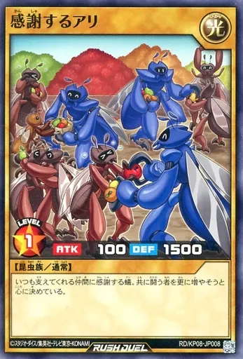 Japanese title: 遊戯王ラッシュデュエル/N/通常モンスター/デッキ改造パック 創造のマスターロード!! RD/KP08-JP008[N]:感謝するアリ