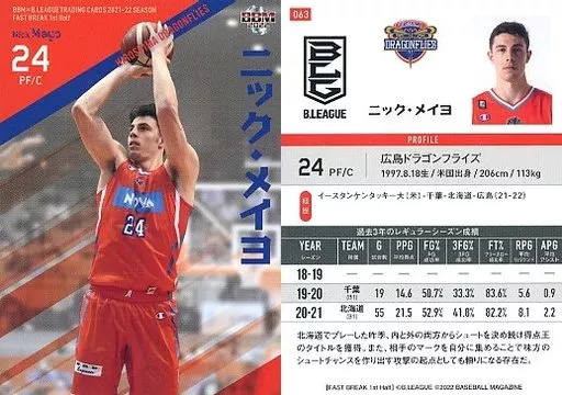 Japanese title: BBM/レギュラーカード/BBM×B.LEAGUE TRADING CARDS 2021-2022 SEASON FAST BREAK 1st Half 063[レギュラーカード]:ニック・メイヨ
