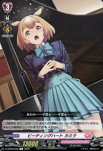 Japanese title: ヴァンガード/C/リリカルモナステリオ/overDress リリカルブースター第2弾 「リリカルモナステリオ ~新学期はじまるよ!~」 D-LBT02/050[C]:ビーティングハート カミラ
