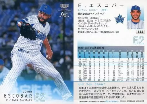 Japanese title: BBM/レギュラーカード/BBM2022 ベースボールカード 1stバージョン 144[レギュラーカード]:E.エスコバー