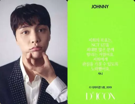 Collection Card (Male) / "Dicon PHOTOCARD101 NCT127" Photo Card NCT127 / Johnny (JOHNNY) / Yellow-green back with Korean message / "Dicon PHOTOCARD101 NCT127" photo card