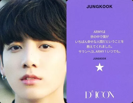 Collection Card (Male) / "Dicon PHOTOCARD101 bts" Photo Card BTS / JUNGKOOK / Purple on the back with Japanese messages / "JAPAN EDITION" / "Dicon PHOTOCARD101 BTS" photo card