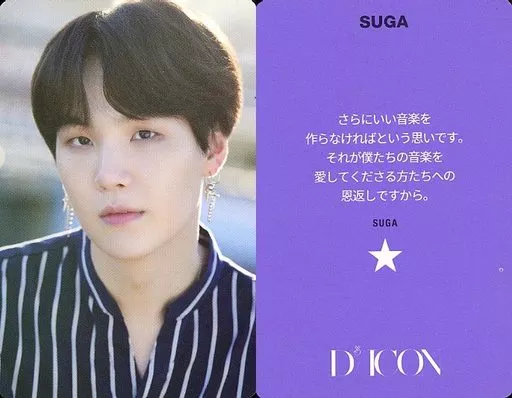 Japanese title: コレクションカード(男性)/「Dicon PHOTOCARD101 BTS」フォトカード 防弾少年団/SUGA(シュガ)/裏面紫・日本語メッセージ入り/「JAPAN EDITION」/「Dicon PHOTOCARD101 BTS」フォトカード