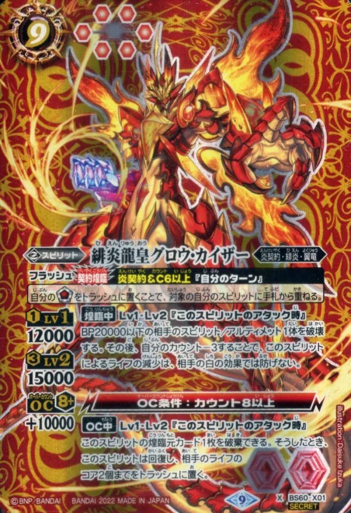Japanese title: バトルスピリッツ/X/スピリット/契約編 第1章 ファーストパートナー BS60-X01[X]:緋炎龍皇グロウ・カイザー(SECRET)