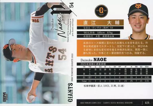 Japanese title: BBM/レギュラーカード/BBM2022 読売ジャイアンツ G25[レギュラーカード]:直江大輔