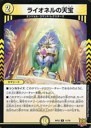Japanese title: デュエルマスターズ/R/光/[DMRP-22]王来MAX最終弾 切札!マスターCRYMAX!! 11/76[R]:ライオネルの天宝