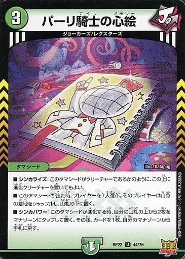 Japanese title: デュエルマスターズ/U/自然/[DMRP-22]王来MAX最終弾 切札!マスターCRYMAX!! 44/76[U]:パーリ騎士の心絵