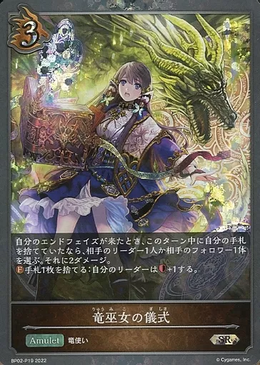 Japanese title: シャドウバース エボルヴ/SR/アミュレット/ブースターパック第2弾「黒銀のバハムート」 BP02-P19[SR]:(プレミアム)竜巫女の儀式