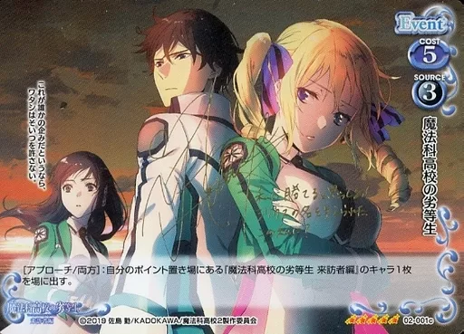 Japanese title: プレシャスメモリーズ/SP/イベント/魔法科高校の劣等生 来訪者編 ブースターパック 02-001c[SP]:(ホロ)魔法科高校の劣等生(日笠陽子金箔押しサイン入り)