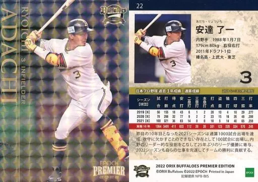Japanese title: スポーツ/レギュラーカード/EPOCH 2022 オリックス・バファローズ PREMIER EDITION ベースボールカード 22[レギュラーカード]:安達了一(ホログラム版)
