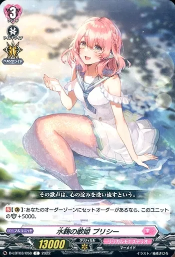 Japanese title: ヴァンガード/C/リリカルモナステリオ/overDress リリカルブースター第3弾 「リリカルモナステリオ ~なつのおもいでっ!~」 D-LBT03/058[C]:水鞠の歌姫 プリシー