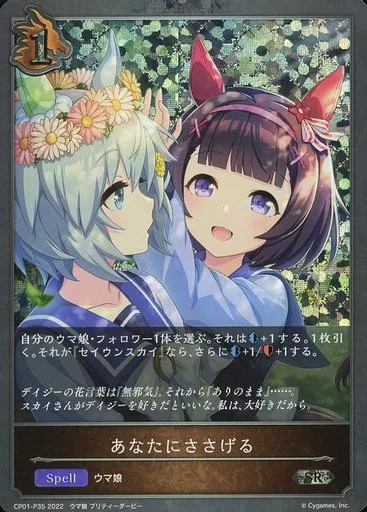 Japanese title: シャドウバース エボルヴ/SR/スペル/コラボパック「ウマ娘 プリティーダービー」 CP01-P35[SR]:(プレミアム)あなたにささげる