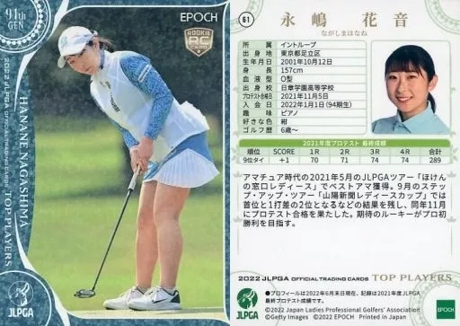 Japanese title: スポーツ/レギュラーカード/2022 JLPGA OFFICIAL TRADING CARDS TOP PLAYERS 61[レギュラーカード]:永嶋花音(青箔版)