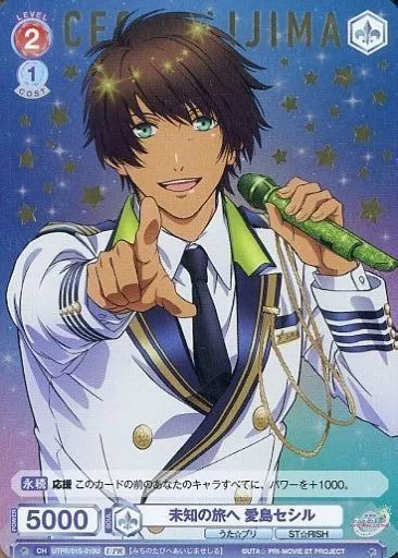 Japanese title: ヴァイスシュヴァルツブラウ/UPR/キャラ/スタートデッキ 劇場版 うたの☆プリンスさまっ♪ マジLOVEスターリッシュツアーズ UTPR/01S-010U[UPR]:(ホロ)未知の旅へ 愛島セシル(金箔押し)