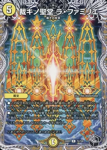Japanese title: デュエルマスターズ/R/光/[DM22-RP2]ゴッド・オブ・アビス 第2弾「轟炎の竜皇」 T5/T20[R]:裁キノ聖堂 ラ・ファミリエ