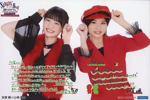 Morning Musume.' 22 / Yamazaki 愛生, Kaga Kaede / horizontal, upper body, with printed message / "Morning Musume.' 22 25th ANNIVERSARY ~ SINGIN' TO THE BEAT ~ Kaga Kaede Graduation Special" 2 shots A5 wide size Official photo