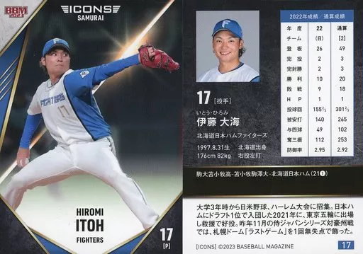 Japanese title: BBM/レギュラーカード/BBMベースボールカードセット2023 ICONS -SAMURAI- 17[レギュラーカード]:伊藤大海