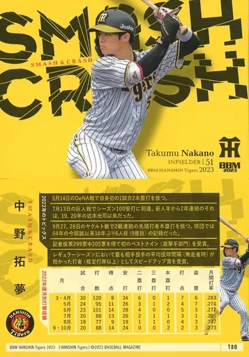 Japanese title: BBM/レギュラーカード/Smash & Crash/BBM 阪神タイガース ベースボールカード2023 T80[レギュラーカード]:中野拓夢
