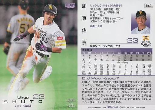 Japanese title: BBM/レギュラーカード/2023 BBM ベースボールカード 1stバージョン 043[レギュラーカード]:周東佑京(キラカード版)