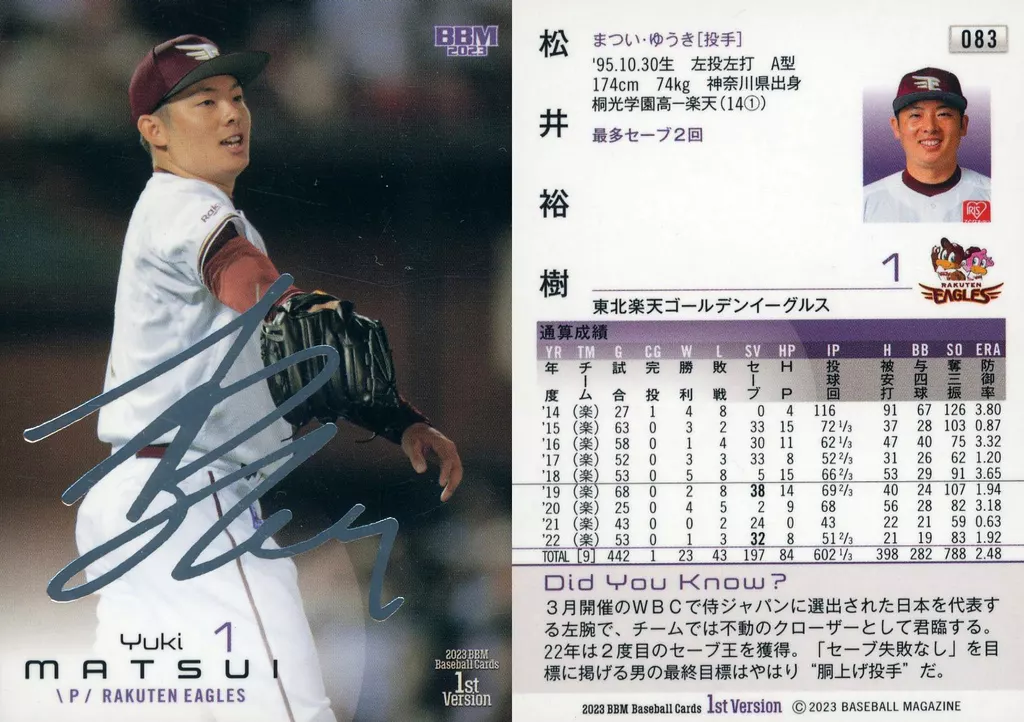 Japanese title: BBM/レギュラーカード/2023 BBM ベースボールカード 1stバージョン 083[レギュラーカード]:松井裕樹(銀箔サイン版)