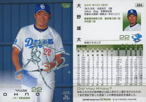 Japanese title: BBM/レギュラーカード/2023 BBM ベースボールカード 1stバージョン 304[レギュラーカード]:大野雄大(ホロ箔サイン版)(/50)